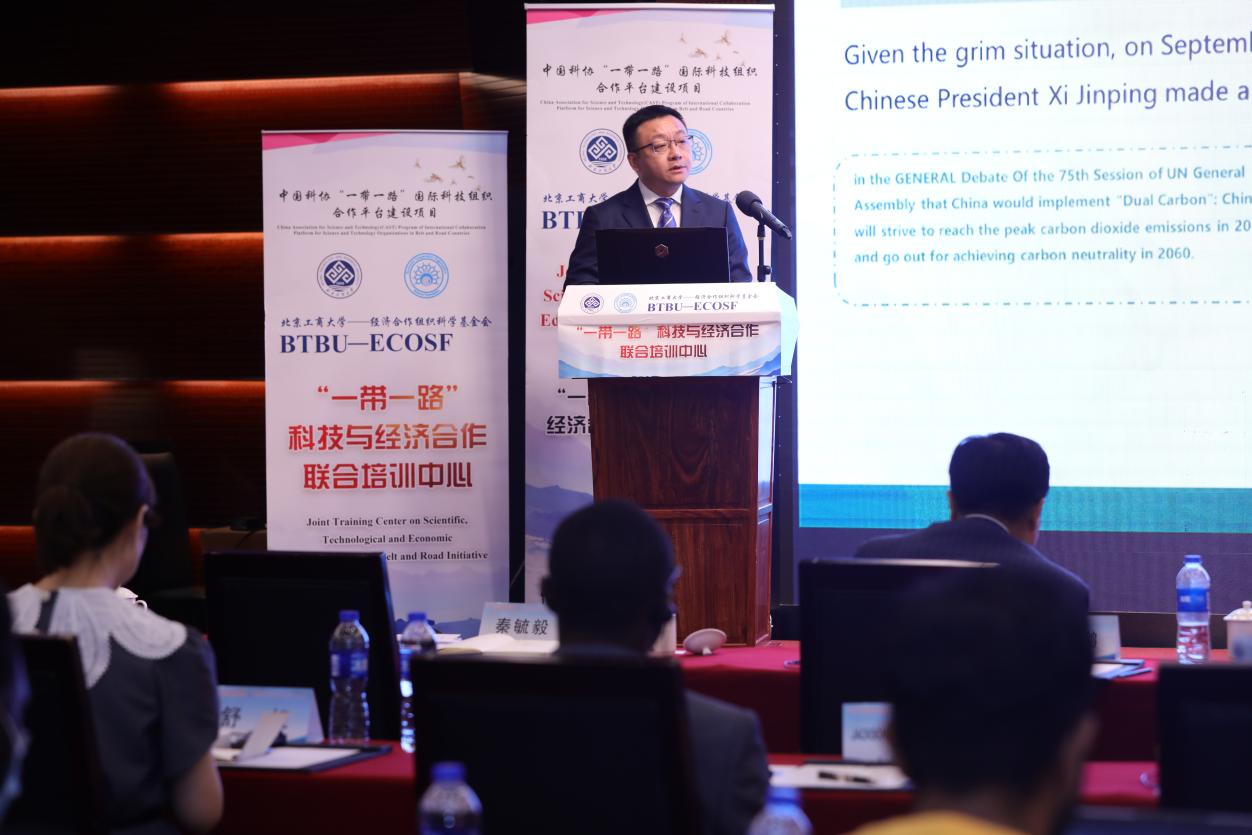 經濟合作組織科學基金會主席曼佐爾·侯賽因·索洛教授在致辭中表示,感謝中國科協的支持,感謝北京工商大學籌備此次培訓。應對氣候變化問題是全球共識,也需要世界各國攜手應對。科技創新在應對氣候變化挑戰中發揮著極其重要的作用。中國的碳中和、碳達峰目標為世界應對氣候變化做出了重要貢獻,也在減排相關領域取得了顯著成果。經濟合作組織(ECO)成員國正在積極推進低碳發展規劃和新能源汽車產業,需要從中國學習相關的規劃路徑、發展模式、產業升級等方面的經驗。相信此次培訓將給成員國帶來值得借鑒的經驗,推動“一帶一路”國際合作和可持續發展。