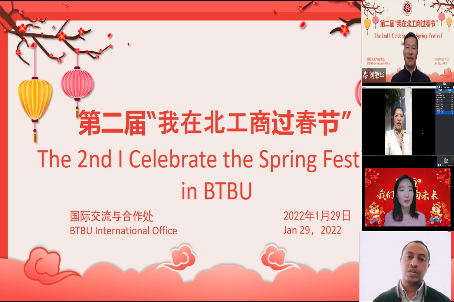 春節來臨之際,為豐富留校國際學生的假期生活,增進他們對中國傳統節日和習俗文化的了解,1月29日,學校舉辦第二屆國際學生“我在北工商過春節” 線上活動,劉敏華副校長、國際交流與合作處全體人員、部分留校國際學生參加了此次活動。