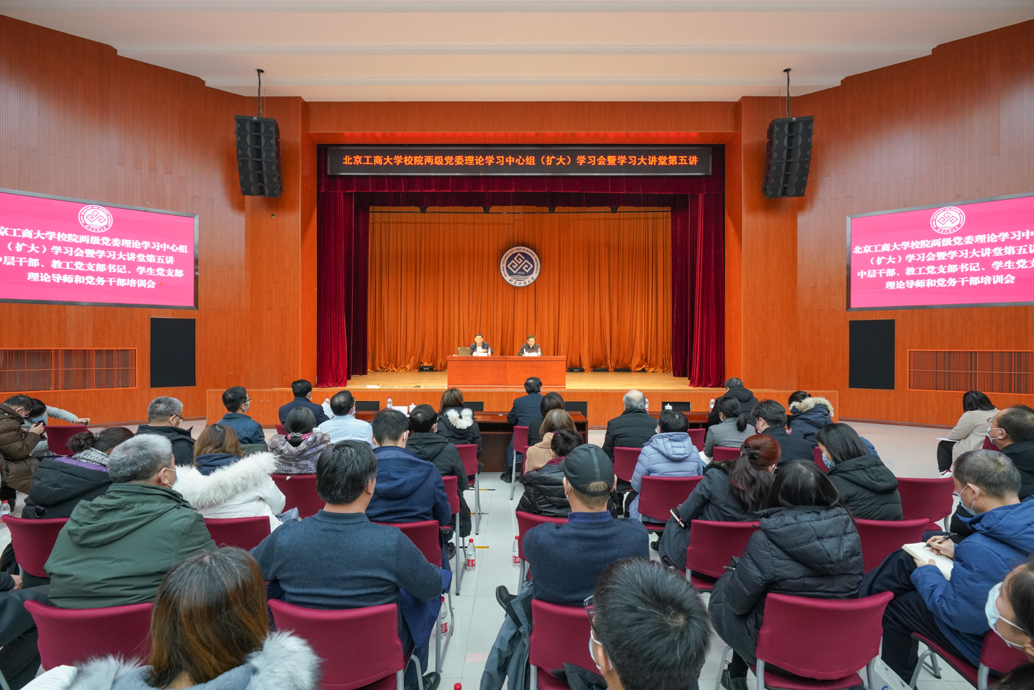 為深入學習貫徹黨的十九屆五中全會和市委十二屆十五次全會精神,12月23日下午,學校在阜成路校區舉行校院兩級黨委理論學習中心組(擴大)學習會暨學習大講堂第五講,以及中層干部、教工黨支部書記、學生黨支部理論導師和黨務干部集中培訓。學校領導孫寶國、張德玉、賈英民、方德英出席。校院兩級黨委理論學習中心組成員、中層干部、教工黨支部書記、學生黨支部理論導師、專職組織員近300人參加。講座由學校黨委副書記張德玉主持。