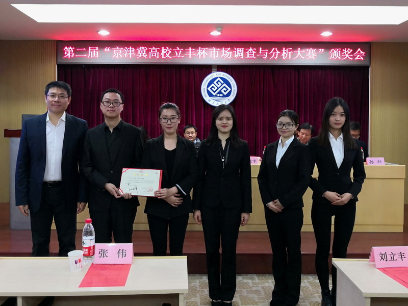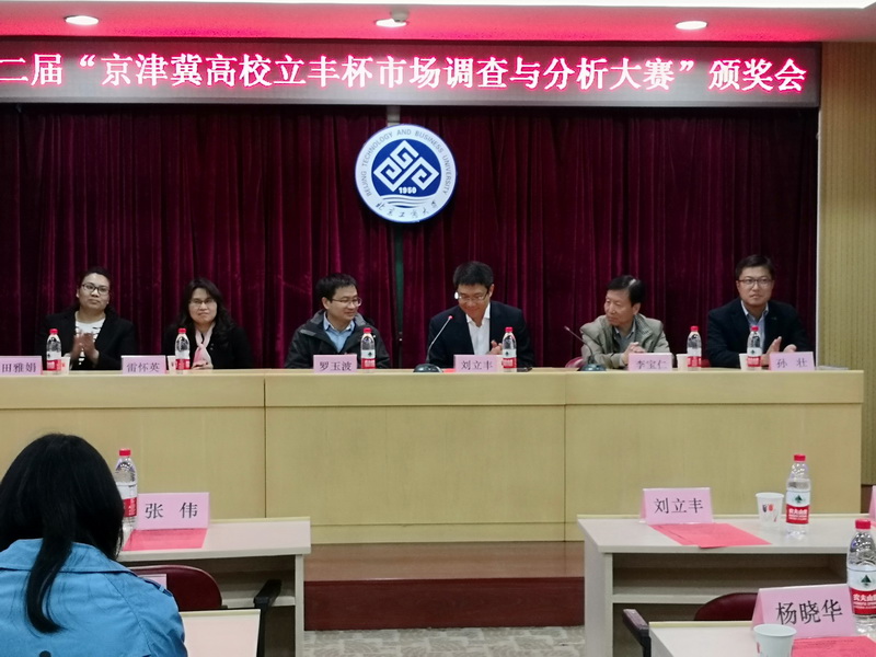 4月14日,第二屆京津冀高校立豐杯市場調查與分析大賽在我校阜成路校區舉辦。本次比賽由我校教務處、經濟學院和北京益普索市場咨詢公司主辦,京津冀經濟學學科協同創新聯盟協辦,經濟學院統計系承辦。北京益普索市場咨詢有限公司劉立豐董事長、天津工業大學雷懷英教授、河北大學田雅娟副教授和我校經濟學院副院長張偉、羅玉波,教務處孫壯等嘉賓出席,并分別擔任本次大賽總決賽的答辯評審專家和頒獎嘉賓,參會師生近百余人。大賽的頒獎環節由張偉主持。