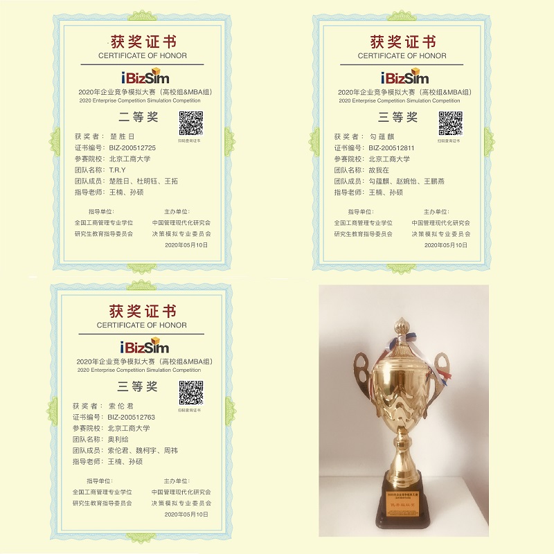 5月10日,2020年企業(yè)競(jìng)爭(zhēng)模擬大賽(高校組&MBA組)落幕,我校MBA教育中心七支MBA隊(duì)伍參賽,榮獲一個(gè)二等獎(jiǎng),兩個(gè)三等獎(jiǎng),指導(dǎo)教師王楠、孫碩榮獲優(yōu)秀指導(dǎo)獎(jiǎng),北京工商大學(xué)MBA教育中心榮獲優(yōu)秀組織獎(jiǎng)。