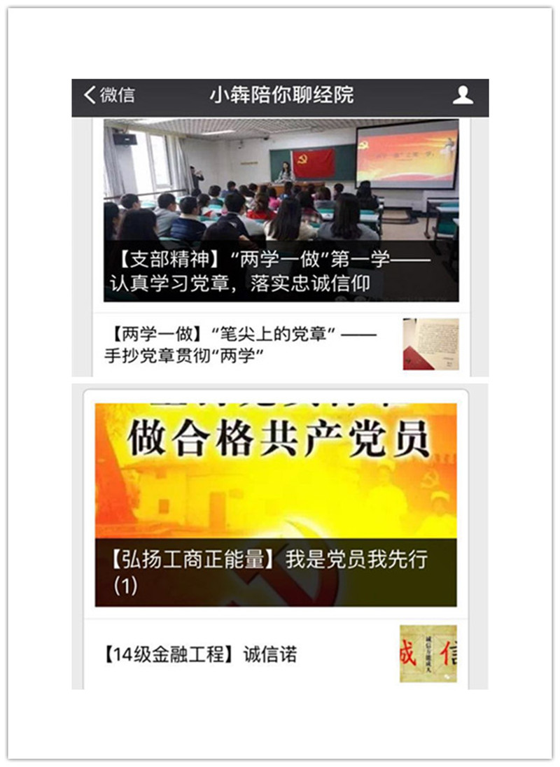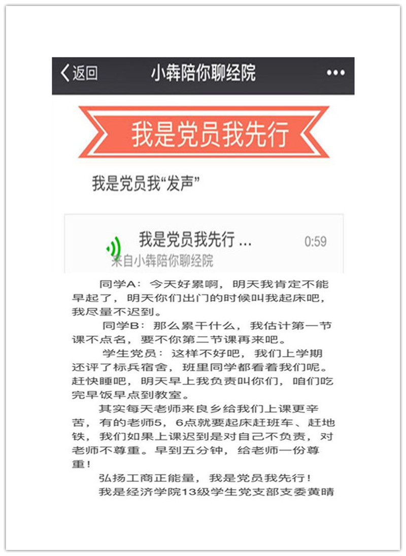 學(xué)生黨員勇于“發(fā)聲”,通過學(xué)院微信平臺(tái)“小犇陪你聊經(jīng)院”,每天推出一期學(xué)生黨員“弘揚(yáng)工商正能量”公益語(yǔ)音活動(dòng),由學(xué)生黨員錄制1分鐘微音頻,圍繞尊師重道、感恩父母、衛(wèi)生宿舍、文明禮儀、節(jié)約用水、安全用電、走下網(wǎng)絡(luò)、走出宿舍、走向操場(chǎng)等為主題展開“發(fā)聲”號(hào)召,通過線上線下互動(dòng)結(jié)合,向在校學(xué)生弘揚(yáng)工商正能量,傳播核心價(jià)值觀。