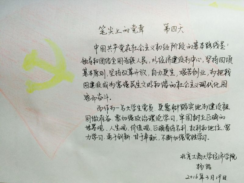 3月初,學(xué)院學(xué)生黨支部開展了“筆尖流走,手書黨章黨規(guī)”活動(dòng),旨在通過“抄、展、評(píng)”三個(gè)環(huán)節(jié),引導(dǎo)黨員逐條逐句抄寫黨章黨規(guī)和系列講話,牢記入黨誓言,牢記黨的宗旨。活動(dòng)開展以來(lái),學(xué)生黨員積極響應(yīng),其中既有極富創(chuàng)意的入黨積極分子的感想,也有書法精湛的預(yù)備黨員和正式黨員的作品。他們說(shuō),好久沒有認(rèn)真寫過文字了,通過摘抄一段有感觸的黨章內(nèi)容,感覺文字靜靜地流進(jìn)心中,也進(jìn)一步牢記了黨的全心全意為人民服務(wù)的宗旨。