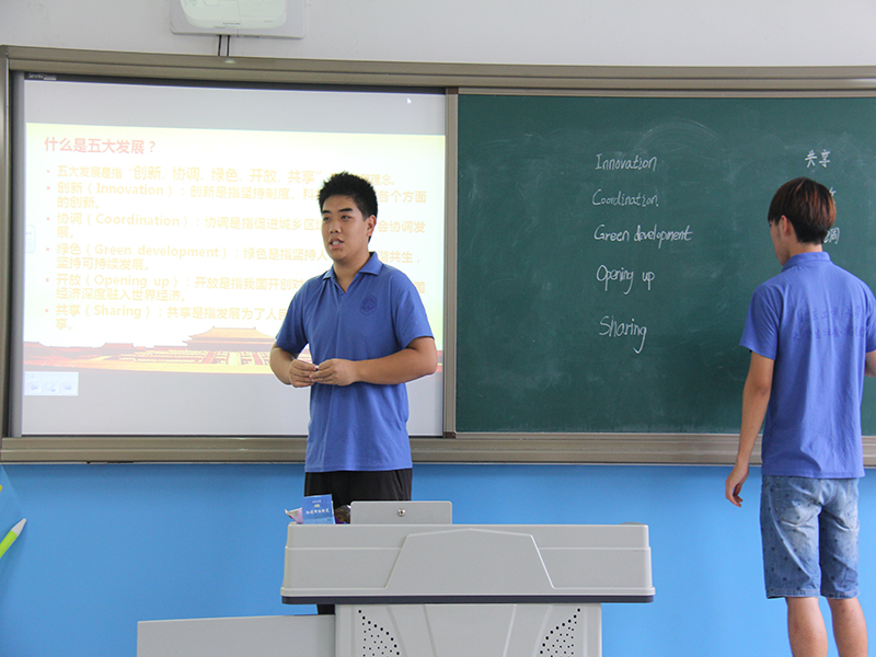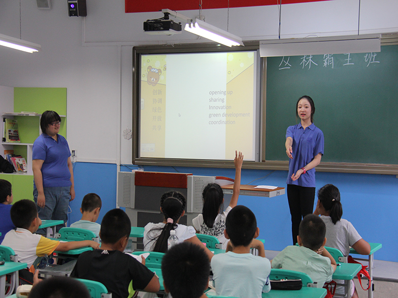經(jīng)過前幾日的基層調(diào)研,實踐團成員意識到,五大發(fā)展理念在房山區(qū)蘇莊村的普及程度較低,身為大學生應(yīng)當牢固樹立并切實貫徹創(chuàng)新、協(xié)調(diào)、綠色、開放、共享的發(fā)展理念,結(jié)合英語專業(yè)優(yōu)勢在農(nóng)村地區(qū)加以宣傳。英語暑期夏令營組織學生召開以“五大發(fā)展理念”為主題的雙語班會。在實踐團成員的帶領(lǐng)下,學生們通過新穎有趣的形式掌握了“創(chuàng)新、協(xié)調(diào)、綠色、開放、共享”的英文表達方式。