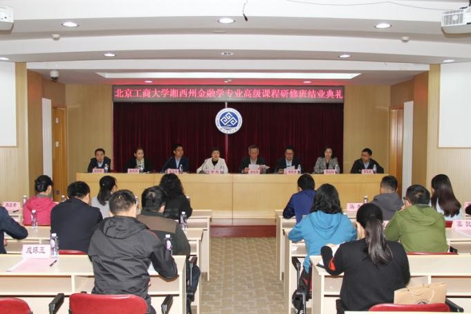 10月19日,由我校與湘西州政府合作主辦,我校經濟學院承辦的2016年度湘西州金融學專業高級課程研修班在阜成路校區舉行結業典禮。副校長謝志華和湘西州副州長徐虹出席結業典禮。湘西州委組織部副部長杜修林,我校研究生院院長楊德勇,經濟學院院長徐丹丹、副院長羅玉波、教授代表葛紅玲,湘西民族職業技術學院成教部副主任顏河玲以及研修班部分學員參加了結業典禮。結業典禮由經濟學院黨委書記張正平主持。