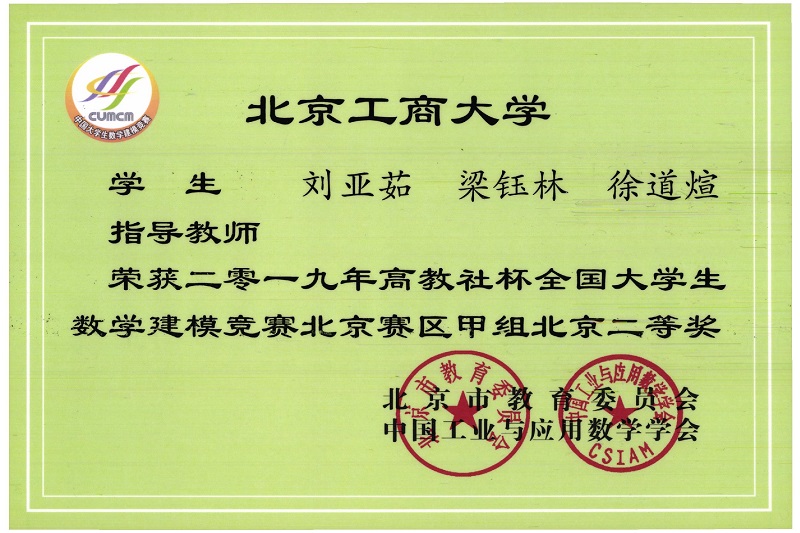 同時(shí),在剛剛公布的2019年高教社杯全國(guó)大學(xué)生數(shù)學(xué)建模競(jìng)賽暨北京市大學(xué)生數(shù)學(xué)建模與計(jì)算機(jī)應(yīng)用競(jìng)賽獲獎(jiǎng)名單中,我校49支參賽隊(duì)伍經(jīng)過4天的緊張奮戰(zhàn),獲北京市二等獎(jiǎng)5項(xiàng)。