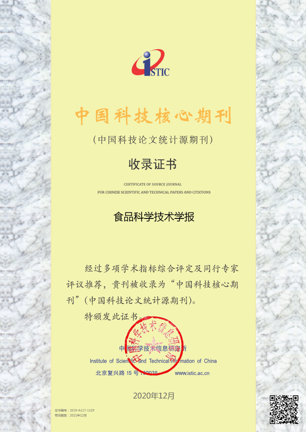 另據中國科學技術信息研究所發布的2020年版《中國科技期刊引證報告》,《食品科學技術學報》擴展影響因子上升為3.50,連續6年位列食品行業期刊第1名;刊物的其他各項評價指標穩居食品行業期刊前列,同時期刊繼續入選“中國科技核心期刊”。中國知網發布的《2020中國學術期刊影響因子年報》顯示,《食品科學技術學報》復合影響因子繼續位列食品行業期刊第二名,再次入選中國學術期刊食品科學技術類影響力指數Q1區。