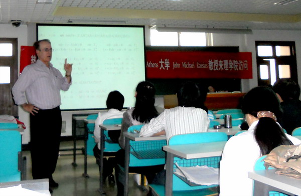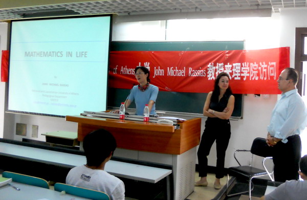 9月20日和21日下午,希臘數(shù)學(xué)家John Michael Rassias 和Vasso 來理學(xué)院講學(xué),在良鄉(xiāng)校區(qū)為理學(xué)院師生做了精彩報告,題目分別為 “The exterior Bitsapze-Ravrentjev problem for quarter elliptic-quarter hyperbolic equations in a double connected domain”和 “Mathematics in life”,陪同而來的北師大數(shù)學(xué)學(xué)院鄧冠鐵教授也為理學(xué)院的師生介紹了關(guān)于概率論與函數(shù)論相結(jié)合的最新科研成果。