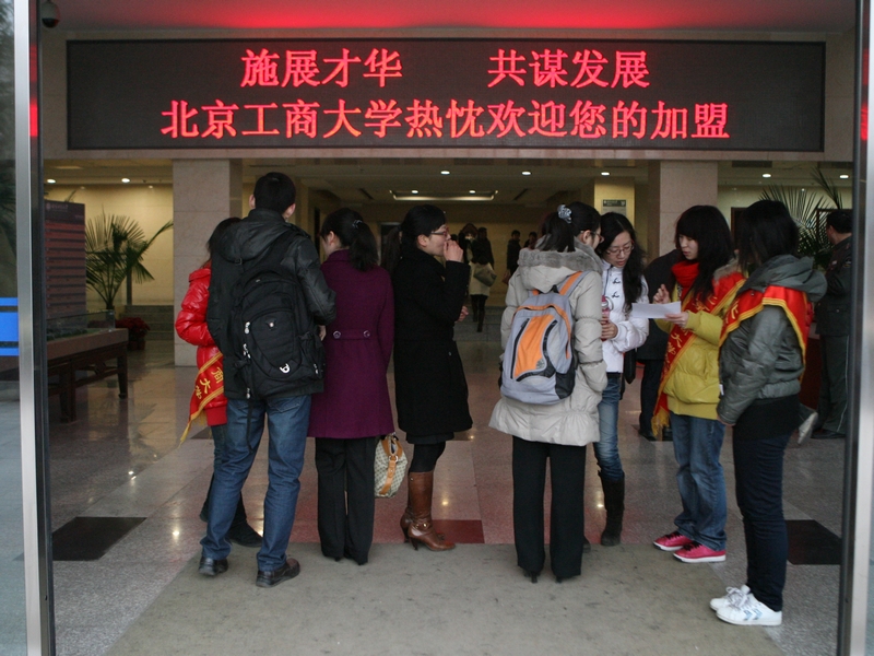 鮮艷的彩旗在校園內迎風飄揚,“招賢聚能 廣納賢才”、“施展才華 共謀發展 北京工商大學熱忱歡迎您的加盟”的橫幅格外醒目。一大早,來自四面八方的應聘人員就絡繹不絕地來到北京工商大學。