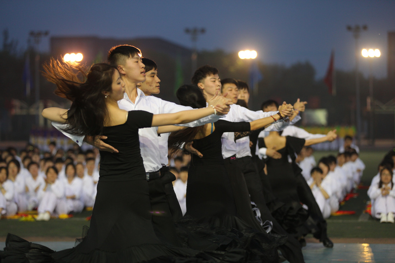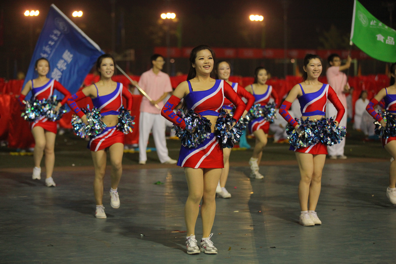 奏樂聲起,校管樂團演奏的《勇往直前進行曲》響徹全場,操場的中央,法學院的一百名學生身著黃色服裝,揮舞著各學院院旗和91個學生社團的旗幟,在燈光的照耀下,形成了一幅百旗飄揚的壯觀景象。
