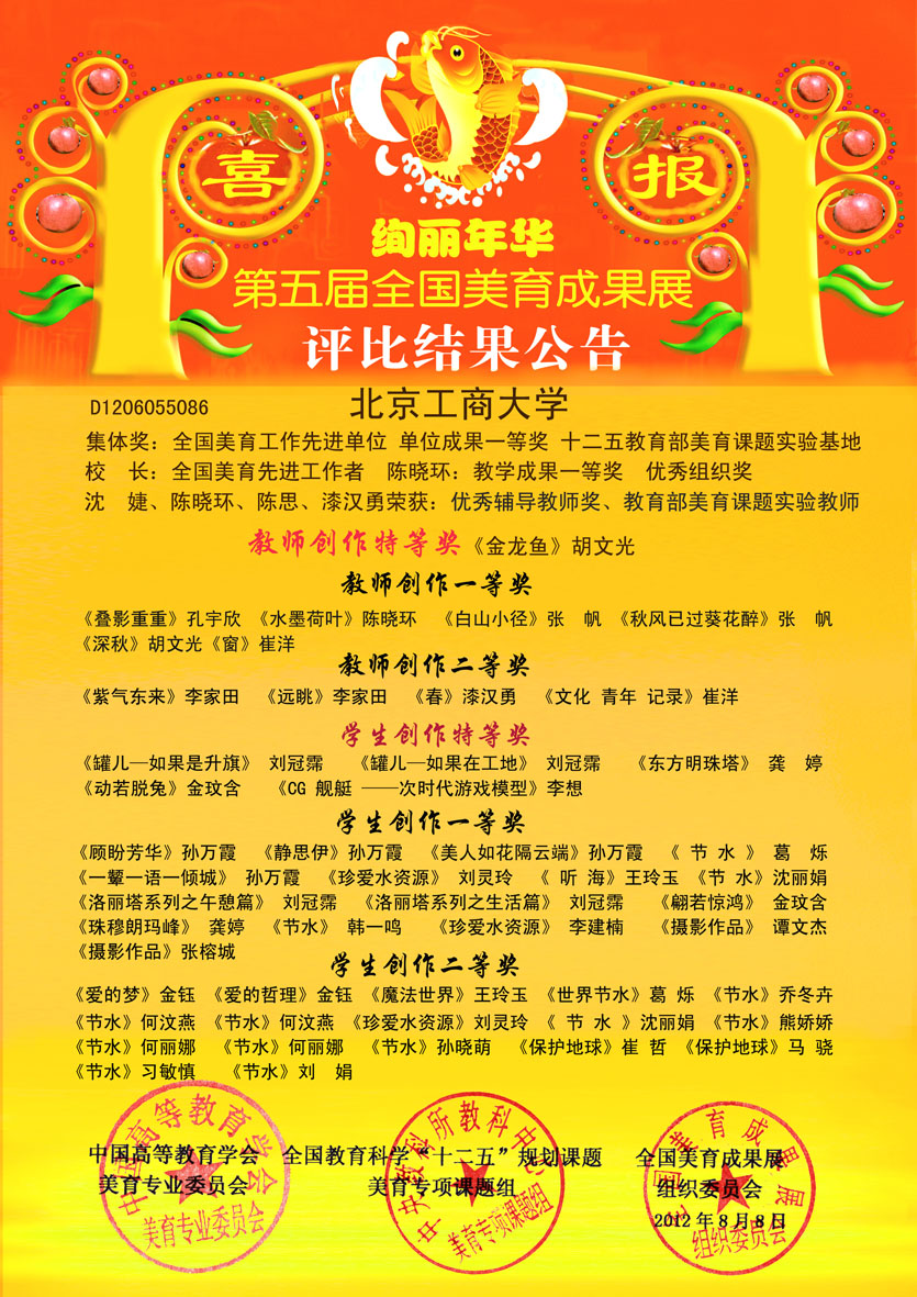 我校榮獲全國美育工作先進(jìn)單位、單位成果一等獎(jiǎng)、“十二五”教育部美育課題實(shí)驗(yàn)基地三項(xiàng)集體獎(jiǎng);藝傳學(xué)院教師沈婕、陳曉環(huán)、陳思、漆漢勇榮獲優(yōu)秀輔導(dǎo)教師獎(jiǎng)、教育部美育課題實(shí)驗(yàn)教師稱號(hào);胡文光、孔宇欣、陳曉環(huán)、張帆、崔洋、李家田、漆漢勇分別榮獲教師創(chuàng)作特等獎(jiǎng)、一等獎(jiǎng)和二等獎(jiǎng);學(xué)生獲創(chuàng)作特等獎(jiǎng)、一等獎(jiǎng)和二等獎(jiǎng)共38項(xiàng)。