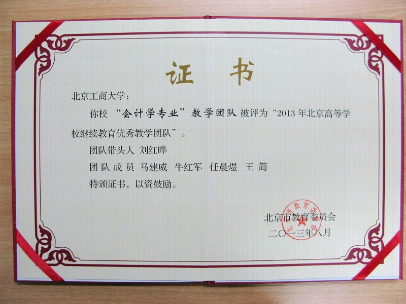 在北京市教育委員會首次組織的面向繼續(xù)教育評獎中,我校繼續(xù)教育學院以劉紅曄副教授為帶頭人的“會計學專業(yè)”教學團隊被評為“2013年北京高等學校繼續(xù)教育優(yōu)秀教學團隊”,并被評為重點建設(shè)團隊;副院長劉萍榮獲得“2013年北京高等學校繼續(xù)教育教學管理先進個人”稱號。