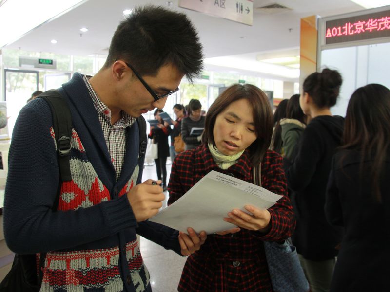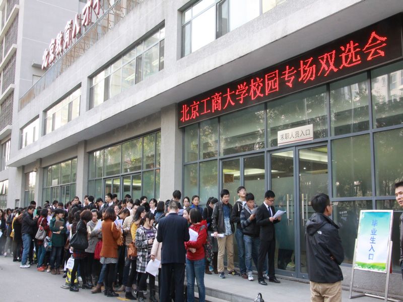 畢業生積極響應,單場參會人數達2千余人。開場不久后,部分用人單位展臺已被學生圍得水泄不通,國企、事業單位、有解決戶口能力的單位仍然是畢業生們的重點關注對象。其中,北京環球國廣商貿有限公司張貼出“公司擇優解決北京戶口”告示,使得該企業成為眾多外地求職學生應聘的首選對象。