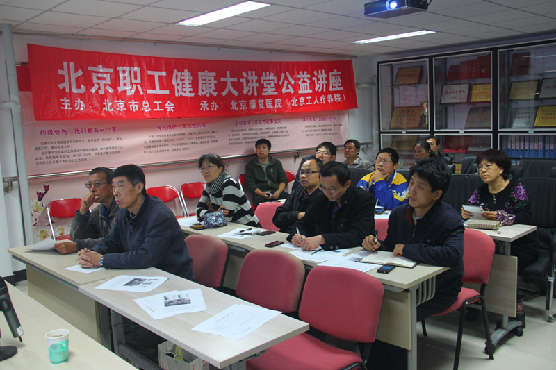 本次活動歷時三個月,得到了北京市總工會、北京市康復醫院專家的支持和幫助,專家們為我校提供免費健康講座服務七場,單元專題涉及到中青年人冠心病的預防、乳腺癌的防治、如何有個強壯的腰、良性前列腺增生的防治、腦卒中的預防與康復治療、中青年職工高血壓的防治、腰間盤突出癥的防治等十分具有針對性的問題。校工會向北京康復醫院有關領導和專家表示衷心感謝,并贈送錦旗。