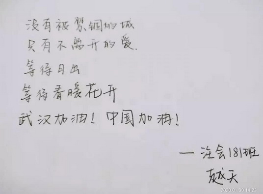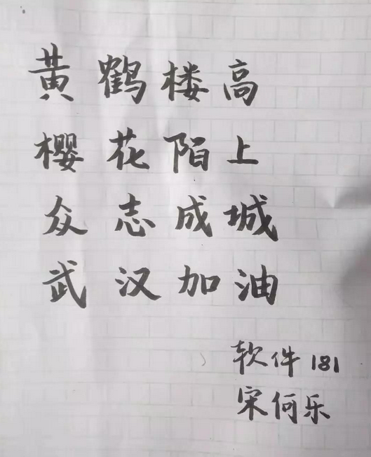 戰(zhàn)勝疫情,共克時(shí)艱。全體武漢同學(xué)們,讓我們攜手并肩,與全國人民一道,弘揚(yáng)中國精神,發(fā)揚(yáng)民族文化,凝聚全體力量,匯聚中國之魂,萬眾一心,眾志成城,不畏艱險(xiǎn),不畏頑疾,相信國家,相信政府,共贏防控阻擊戰(zhàn),共筑健康中國夢!(電子181 高煒)