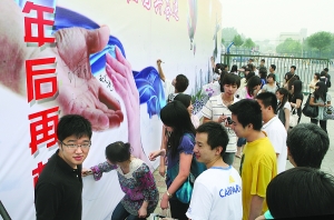 北京工商大學學生畢業(yè)前在學校特制的展板前留言