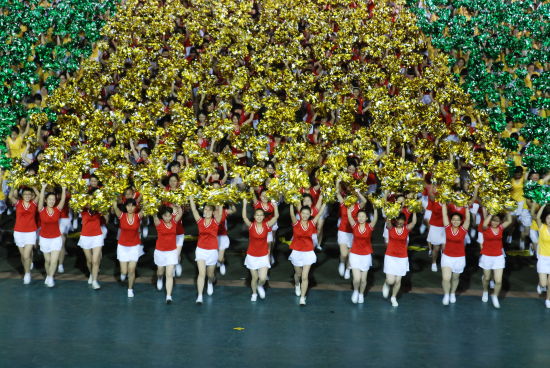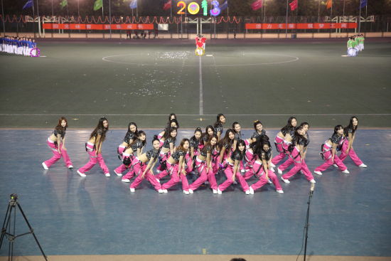 青春的節(jié)奏,讓朝氣蓬勃的大學(xué)生伴隨著樂聲在運(yùn)動(dòng)場上綻放出最美的年華。來自商學(xué)院、經(jīng)濟(jì)學(xué)院、藝術(shù)與傳媒學(xué)院、計(jì)信學(xué)院以及材機(jī)學(xué)院的1008名大一女生踏著歡快的啦啦操歌曲驚現(xiàn)“舞臺(tái)”。她們身著紅色和黃色制服,高舉手花,用各式各樣的隊(duì)形淋漓盡致地展現(xiàn)著“巾幗不讓須眉”的氣魄。長久的期盼在此刻化作了自信的笑容洋溢在每一位同學(xué)的臉上,她們用年輕人的青春蓬勃繪出了一幅又一幅壯美的畫卷:“小飛機(jī)”、“2013”、“花團(tuán)錦簇”不斷地展現(xiàn)在觀眾的視野中。指導(dǎo)教師王立紅說,團(tuán)體操的訓(xùn)練讓同學(xué)們都參與到了體育鍛煉中,看到大家這樣辛苦訓(xùn)練的成果在此刻展現(xiàn),我們真正做到了為自己加油。