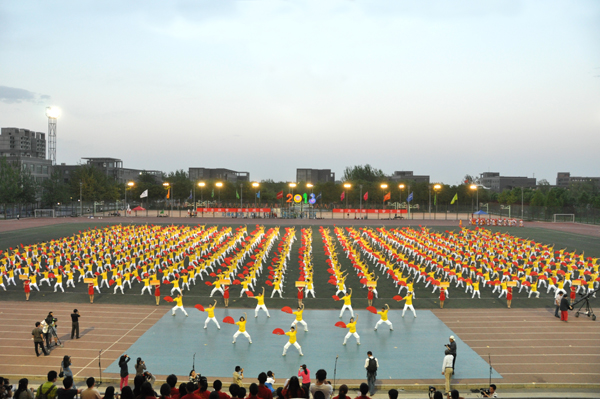 首先上場的是教職工帶來的《中國功夫》太極扇表演。三尺講臺上的老師們今天也踏上了運動場,來自學(xué)校14個分工會的近700名教職工身著黃色上衣、白色運動褲,手持紅色舞扇,豪情萬丈,一招一勢盡展功夫氣魄。太極扇表演在剛?cè)嶂g展現(xiàn) “快樂健康,幸福生活”的理念,近三個月來,各分工會認(rèn)真組織,積極練習(xí),老師們逐漸體會到了太極扇的韻味和樂趣。整齊的動作、颯爽的英姿展示了北工商教職工別樣的風(fēng)采,鮮紅的折扇揮舞出壯麗的美景,精彩的表演激起了現(xiàn)場陣陣的掌聲。