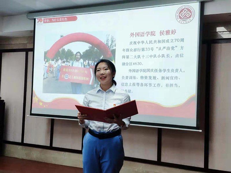 我校經(jīng)濟(jì)學(xué)院退伍大學(xué)生士兵,金融172班王巡東同學(xué),結(jié)合自己攜筆從戎的經(jīng)歷,從擔(dān)任國慶方陣中隊(duì)長的角度,介紹了北工商老兵的責(zé)任和擔(dān)當(dāng),通過鏗鏘有力的宣講,把訓(xùn)練中如何克服“體能關(guān)”“蚊蟲關(guān)”“等待關(guān)”講生動、講明白,凸顯了北工商學(xué)子心向黨,青春無悔獻(xiàn)祖國的愛國情懷。商學(xué)院輔導(dǎo)員李雨晴,從帶隊(duì)輔導(dǎo)員的角度,介紹了輔導(dǎo)員群體在國慶任務(wù)中身在一線,敢于擔(dān)當(dāng)、甘于奉獻(xiàn)的感人事跡。她以自己和祖輩、父輩,三代人與國慶游行的故事作為切入點(diǎn),結(jié)合我校一線帶隊(duì)老師的諸多感人事跡,把通過國家重大活動進(jìn)行思政教育的感悟娓娓道來,詮釋了“立德樹人”的生動內(nèi)涵,表明了輔導(dǎo)員與青春作伴攜手前行的決心。來自學(xué)工部的楊帥,從服務(wù)保障的角度,對那些為國慶默默奉獻(xiàn),卻不能親自走上長安街的人物、事跡進(jìn)行了介紹,闡述了作為共產(chǎn)黨員克服困難,牢記“四個意識”要求的所思所想、所作所為,著重說明了我校黨員師生上下一心、全力以赴保障國慶任務(wù)的事跡,表達(dá)了代表全國九千萬黨員接受祖國和人民檢閱的豪邁情懷。外國語學(xué)院英語162班侯雅婷,作為參訓(xùn)隊(duì)員代表,講述了參與國慶任務(wù)的心路歷程,把北工商學(xué)子在國慶任務(wù)中主動將小我融入大我,自覺服從組織安排,以國家利益為重的良好精神風(fēng)貌進(jìn)行了詳細(xì)闡釋,就“青春為什么是紅色”這個問題進(jìn)行了精彩回答。