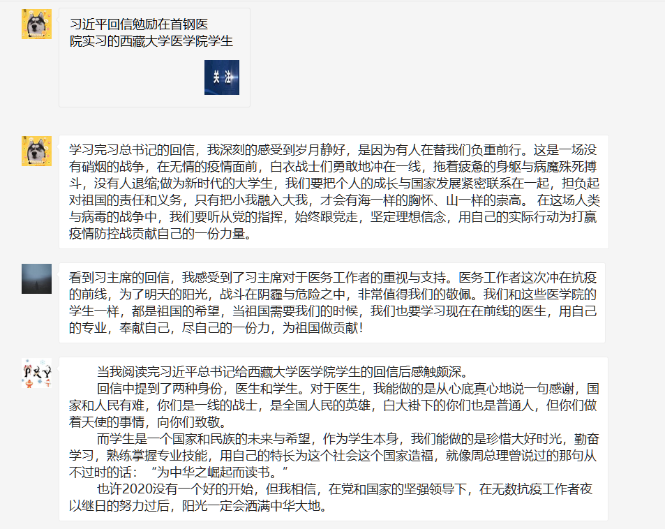 通過線上會議討論交流及線下學習的形式,學院團委組織各團支部認真學習研讀了習總書記的回信。同學們通過分組討論、自學等方式學習了習總書記給西藏大學醫學院在北京大學首鋼醫院實習學生的回信后,備受鼓舞,深感責任重大,在班群內寫下了感悟,分享了學習心得,進一步地感受到了肩上的責任與使命擔當。