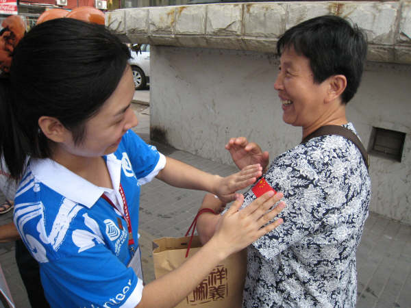 在這段服務(wù)奧運(yùn)的日子里,身為志愿者的我們感受到了太多的關(guān)愛與支持!時(shí)常會(huì)有路人把自己的地圖送給我們的站點(diǎn),方便我們?yōu)楦嗟挠讶朔?wù);時(shí)常會(huì)有住在附近的朋友每天下班后都過來與我們聊天,幫我們一起解決問題;更忘不了年過7旬的老爺爺過來和我們一起唱《朋友》,也忘不了可愛的小朋友每天在公交車站等車時(shí)都來我們站點(diǎn)的愛心貼板上留言,還有為我們提供幫助的同學(xué)——把自己唯一一套央視國(guó)際的轉(zhuǎn)播計(jì)劃和場(chǎng)館地圖等送給了我們服務(wù)的站點(diǎn)等等等等。