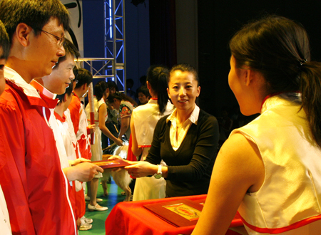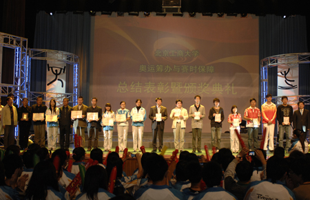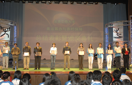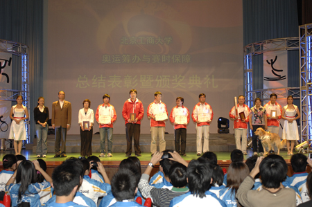 學校黨委副書記盧思鋒宣讀了北京工商大學關于表彰對奧運服務優秀團隊、先進集體和優秀個人的嘉獎令。與會領導、佳賓和奧運冠軍楊楊、仲滿、平亞麗為獲獎代表頒發了獎牌和證書。
