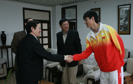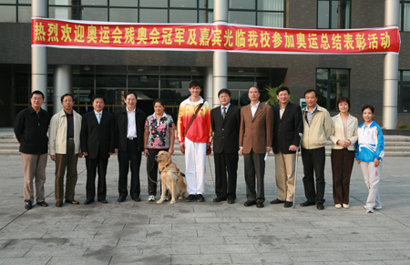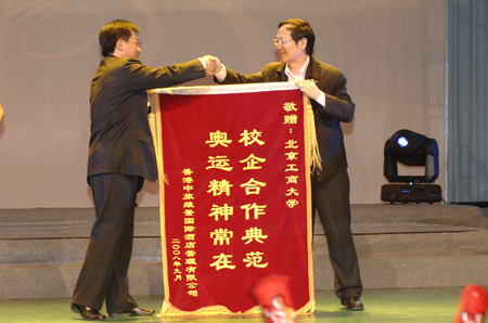 校長譚向勇代表我校向老山自行車場館、港中旅集團負責人贈送錦旗,以感謝他們在奧運期間對我校工作的大力支持。老山自行車場館群主任王宣慶也給我校贈送了錦旗,并轉交了由中共中央國務院授予我校老山自行車場館群團隊“北京奧運會殘奧會先進集體”的榮譽獎牌及證書。
