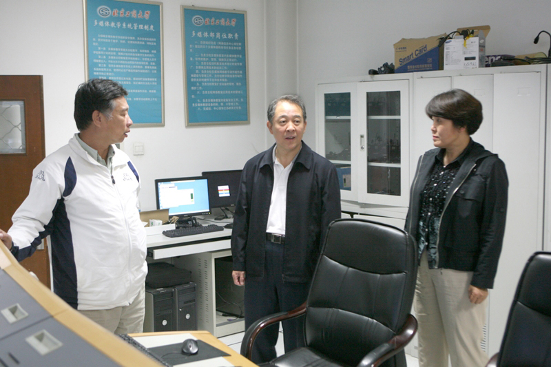 孫堯東同志隨后來到了多媒體控制中心。透過大屏幕可以看見上課的教室里秩序井然,暫時沒有安排課程的教室也都準備就緒。網絡中心主任劉翠玲介紹了部門在暑假期間的主要工作:實現了控制系統的全面升級,完成了對新教室的改造和全校46個教室的移屏工作。孫堯東同志對老師們在假期間堅持辛勤工作表示了感謝,還細心的詢問了教學設備是否到位、家屬區網絡何時入戶等情況。