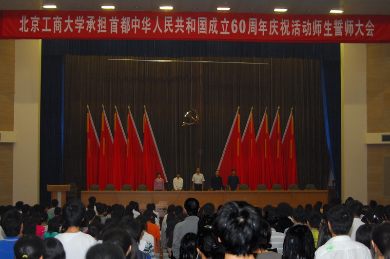 還有不到20小時,建國60周年盛大典禮就將隆重舉行。屆時,我校參加國慶慶祝活動的兩千多名師生將身著鮮艷的演出服裝,手持花環,走過天安門前,接受黨和人民的檢閱。9月30日下午,學校在良鄉校區A報告廳舉行了北京工商大學承擔首都中華人民共和國成立60周年慶祝活動師生誓師大會。誓師大會由學生處處長呂素香主持,群眾游行第五方陣副總指揮、學校黨委副書記盧思鋒、各學院負責人、學校團委書記呂良出席大會。