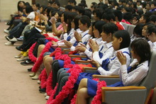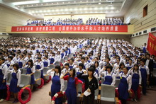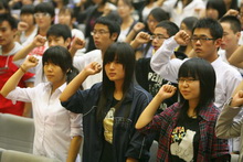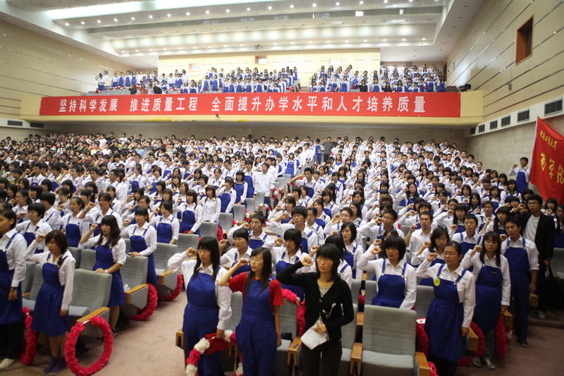 在計算機與信息工程學院和經濟學院師生參加的大會上,莊嚴的國歌聲使每個人心潮澎湃,學生代表的發言更是道出了每個參訓人員的心聲:祖國榮譽,高于一切!在藝傳學院和商學院的誓師會上,商學院的同學身穿正式演出服裝,手持花環,兩院院旗在會場兩側遙相輝映,仿佛是兩面鼓舞士氣的戰旗,整個會場洋溢著喜慶激昂的氣氛。在法學院、機械學院、合唱隊和廣場聯歡團的誓師大會上,氣氛十分熱烈,代表們的發言慷慨激昂,聽眾們的掌聲熱烈持久,反映出參訓師生激動的心情和必勝的信念。
