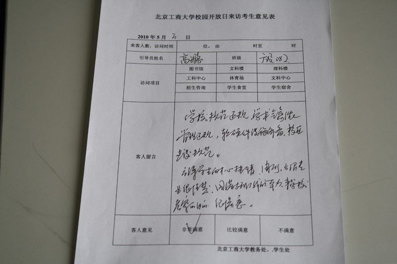“付出是有回報(bào)的”,引導(dǎo)員趙豪杰笑容滿面地翻開一沓沓的《北京工商大學(xué)校園開放日來訪考生意見表》對(duì)記者說道,“你看,隨便一翻都是‘非常滿意’‘環(huán)境優(yōu)美’‘引導(dǎo)員服務(wù)很熱情’,所以,我們做起來是很有激情的,即便是累一點(diǎn)也是很值得的”。