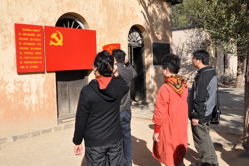 經過近5個小時的車程,大家顧不上休息,風塵仆仆地來到了平山縣西柏坡。抬頭望去滿眼青翠,壯觀的西柏坡紀念館威嚴聳立,前臨碧波蕩漾、水天一色的崗南水庫,后倚滿坡翠柏、松濤陣陣的西柏坡嶺,革命領袖的巨幅雕像屹立在廣場中央。大家懷著崇敬的心情參觀了毛澤東、周恩來、朱德、劉少奇等革命偉人生活和工作的地方,這些又矮又小、外墻抹著一層白灰、屋里抹著一層黃泥的平頂房,家家戶戶木板門,井字型的方格窗,沒有一點雕飾。就是在這樣的艱苦條件下,中國革命的領袖們穿著粗布舊衣、吃著粗茶淡飯,卻運籌帷幄地指揮了震驚世界的遼沈、淮海、平津三大戰役,取得了革命戰爭的全面勝利。