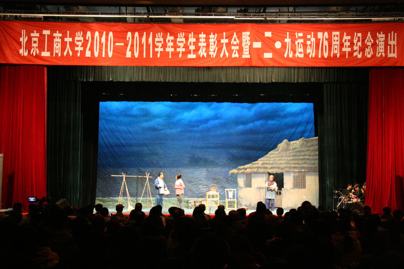 2010-2011學年本科生先進表彰暨一二·九運動76周年紀念演出于12月9日晚在良鄉校區文體館隆重舉行。校領導譚向勇、盧思鋒、李朝鮮、方德英以及相關職能部門負責人出席了會議。北京國粹藝術傳承促進會副會長、新聞界京劇俱樂部秘書長梁淅,北京電視臺工會主席孟傳妍等校外嘉賓參加了本次活動。