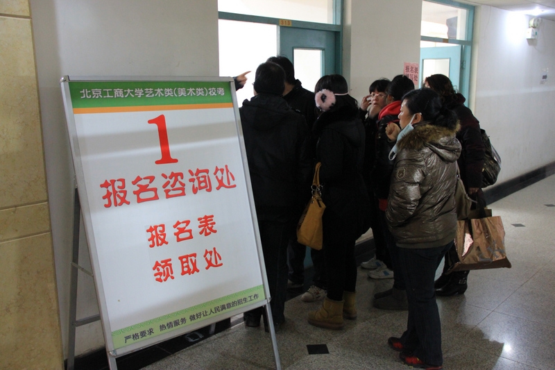 另一位來自內(nèi)蒙古呼和浩特的家長告訴記者,“我們昨天坐了十二個多小時的火車,晚上八點左右才到北京,隨后在奧運村找了個住處。今早又起了個大早來北京工商大學(xué)報名。”這位父親的眼神里充滿了疲憊,卻同樣有著藏不住的激動和欣喜:“女兒從小就很喜歡畫畫,她也一直很努力,女兒這次在北京報了好幾所學(xué)校,我相信她一定能考出很棒的成績。”