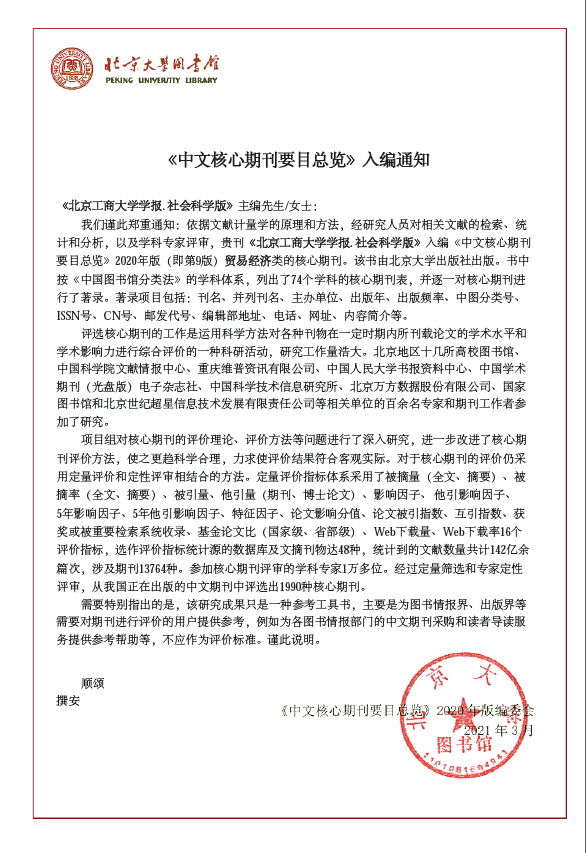 近日,南京大學中國社會科學研究評價中心(CSSCI)發布了最新的CSSCI來源期刊目錄(2021—2022),《北京工商大學學報(社會科學版)》再次入選CSSCI來源期刊,這也是學報自2006年以來連續第8次入選CSSCI來源期刊目錄。本年度,學報還入編北京大學《中文核心期刊要目總覽》2020年版(即第9版)貿易經濟類的核心期刊,并入選中國人民大學“復印報刊資料重要轉載來源期刊(2020年版)”。