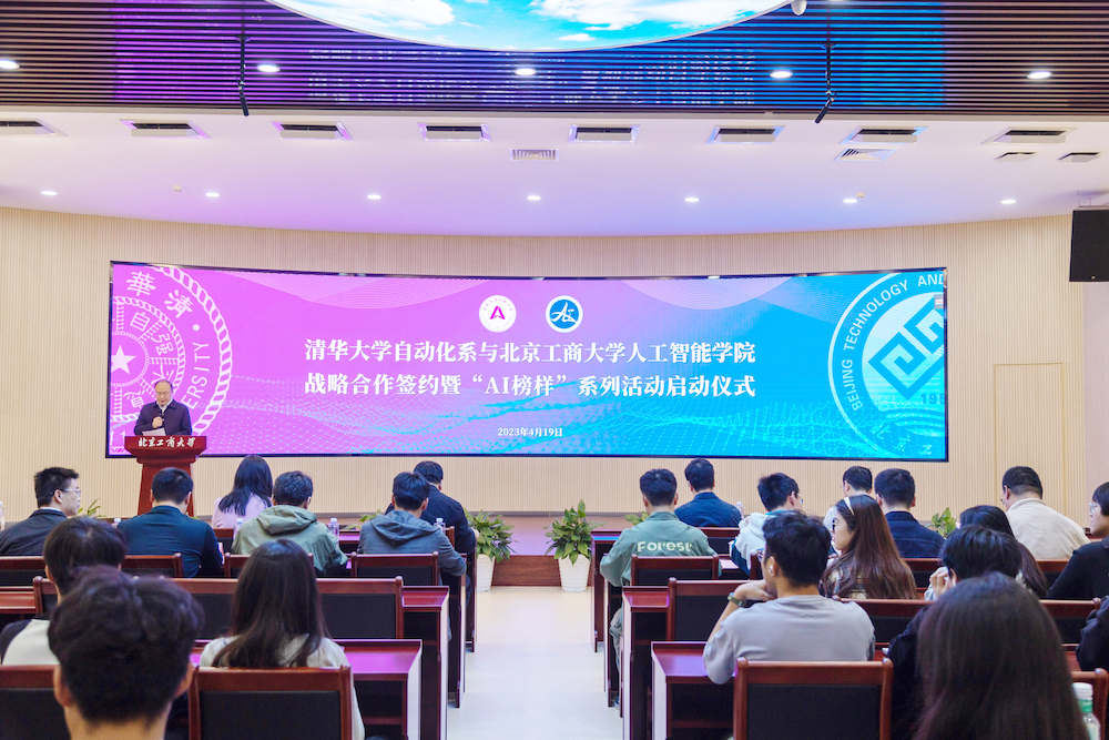 4月19日,清華大學自動化系與北京工商大學人工智能學院戰略合作簽約暨“AI 榜樣”系列活動啟動儀式在我校良鄉主校區舉行。清華大學自動化系主任張濤、系黨委副書記古槿,系黨委學生組組長尚超蒞臨指導,自動化系學生代表隨行來校交流。校黨委常委、副校長劉敏華出席儀式并致辭,學校相關職能部門、人工智能學院領導及師生代表參加。