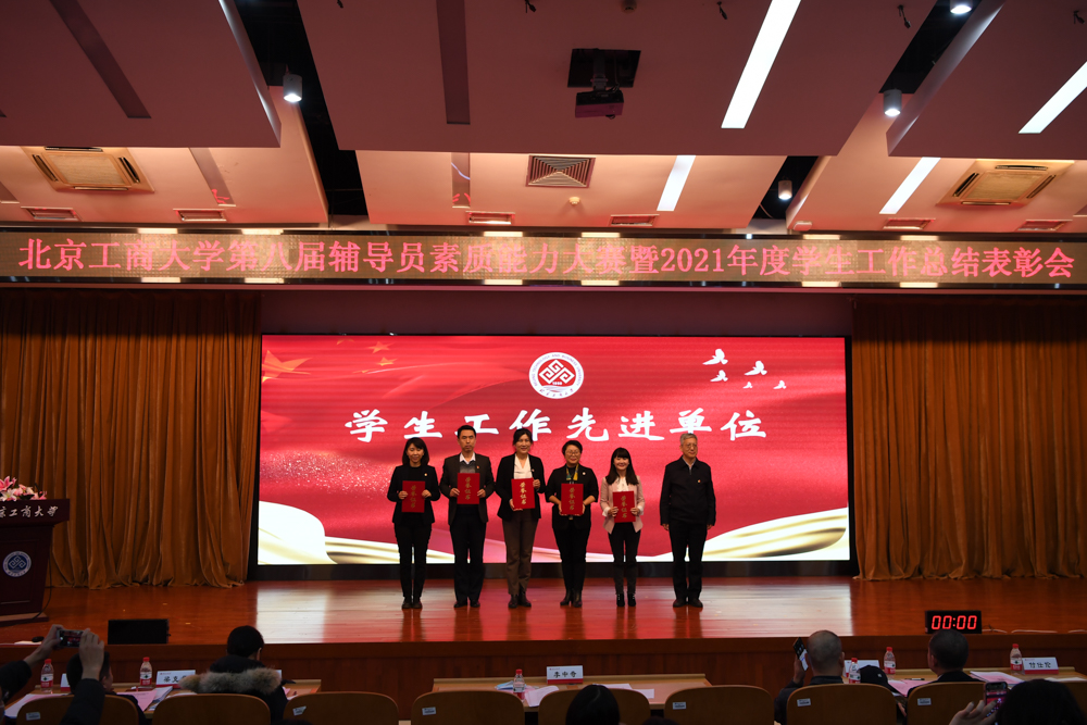 表彰大會環節,與會人員集中觀看2021年學生工作總結視頻。學生處處長呂良宣讀《關于表彰北京工商大學2021年度學生工作先進集體與先進個人的決定》,李中奇副書記、職能部門負責人現場為優秀輔導員、十佳輔導員、十佳班主任、第八屆素質能力大賽前三名及專項工作先進集體、學生工作先進單位頒發了獎項。