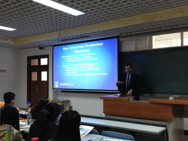 在法/馬學院,愛爾蘭都柏林大學校長助理王黎明教授、法學院院長柯林•斯科特(Colin Scott)教授和法學院行政主管雪芳•阿特曼(Xuefang Alterman)與法學院負責人就雙方法學院的合作項目進行了深入的會談,雙方商定將繼續積極推進雙方“3+1”合作項目的實施,并就“3+1”項目執行的具體細節進行了交流;雙方還就研究生交換項目以及教師交流項目進行了探討。會談結束后,柯林•斯科特院長為法學院學生做了題為“歐盟法規與治理”的講座。