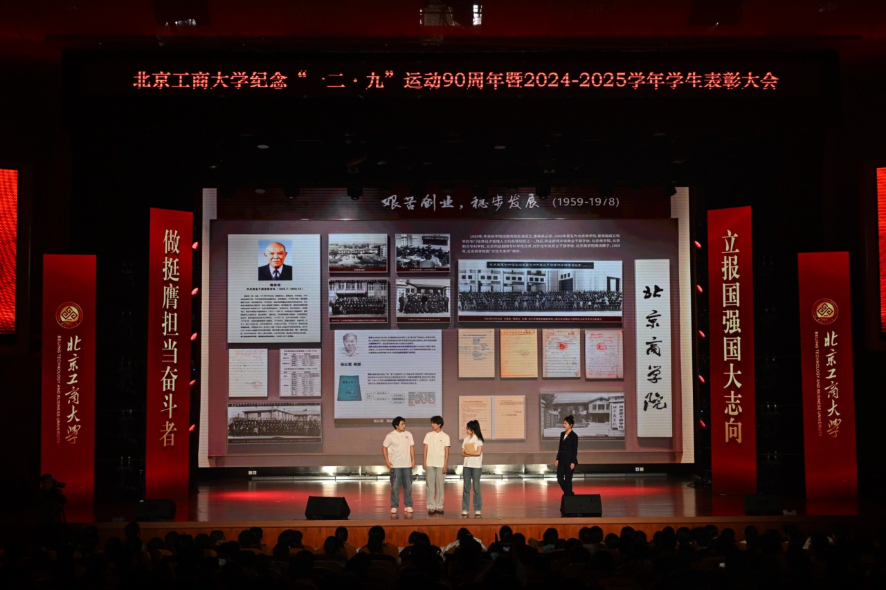 12月10日,北京工商大學紀念“一二·九”運動90周年暨2024-2025學年優秀學生表彰大會在良鄉主校區舉行。校領導沈千帆、郭建華、李中奇、宋曉欣、楊紅、徐丹丹、鄧祥征出席大會,相關職能部門負責人、各學院黨政領導、校友獎學金代表、校友代表、教師代表、獲獎學生代表參加大會。大會榮幸邀請到了當年曾參與和組織“一二·九”運動的黃華、陸平兩位革命先輩的后代:黃玫女士與陸瑩女士,與全場師生一起見證傳承歷史偉績,表彰青春榜樣,激昂奮斗力量。