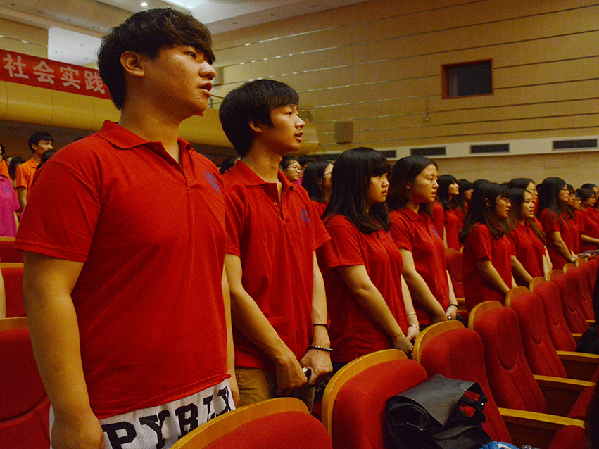交接儀式進(jìn)行的同時(shí),實(shí)踐團(tuán)的其他成員收拾行李,熟悉校園和宿舍,準(zhǔn)備下午與夏令營(yíng)“小營(yíng)員”們的初次見(jiàn)面會(huì)。本期夏令營(yíng)共分為五個(gè)班級(jí),每個(gè)班級(jí)有15至16名即將升到初二的學(xué)生。見(jiàn)面會(huì)安排在了東樓三層的多功能教室,由學(xué)院輔導(dǎo)員程遠(yuǎn)老師主持。學(xué)院團(tuán)總支書(shū)記徐亮老師向在座的每一位同學(xué)介紹了本次“十鄉(xiāng)百村千人行”的活動(dòng)情況以及學(xué)校和學(xué)院概況。分班儀式上,除了各班“班主任”例行的自我介紹,每個(gè)班的“老師”還進(jìn)行了才藝展示,其中杜翊豪同學(xué)的演唱更是贏得了小營(yíng)員們的熱烈掌聲,將見(jiàn)面會(huì)的氣氛引向高潮。