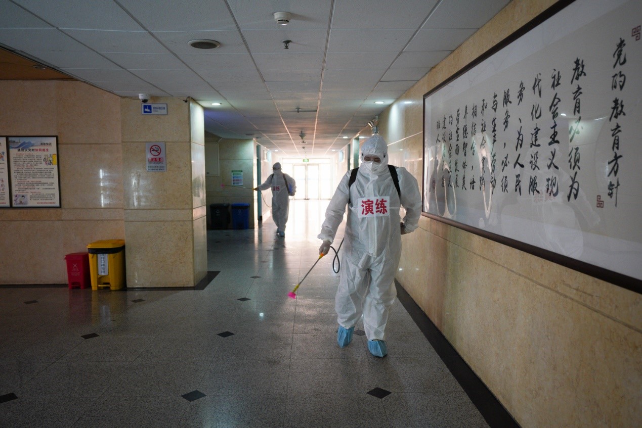 公共事務處組建專業隊伍,對“確診”學生所在教學樓及宿舍樓進行采樣及全面消殺,安排專人做好醫療垃圾處理。