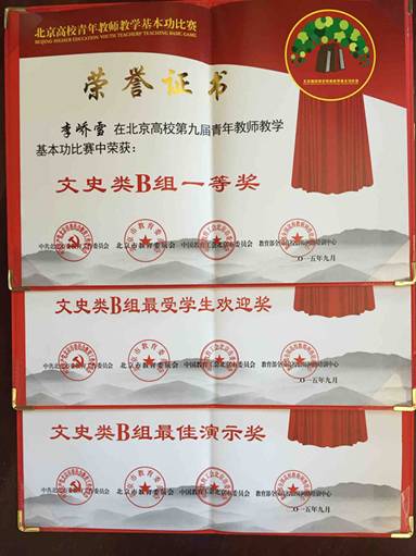 在個人獎項中,理學院曹顯兵老師榮獲2015年北京市先進工作者,藝傳學院李嶠雪老師榮獲北京高校第九屆青年教師教學基本功比賽文史類B組一等獎、最佳演示獎、最受學生歡迎獎,藝傳學院高麗華老師榮獲北京高校第九屆青年教師教學基本功比賽優秀指導教師獎,藝傳學院何艷老師榮獲北京高校第九屆青年教師教學基本功論文比賽獲優秀獎,學校工會李艷萍老師榮獲2015年北京市優秀工會工作者。
