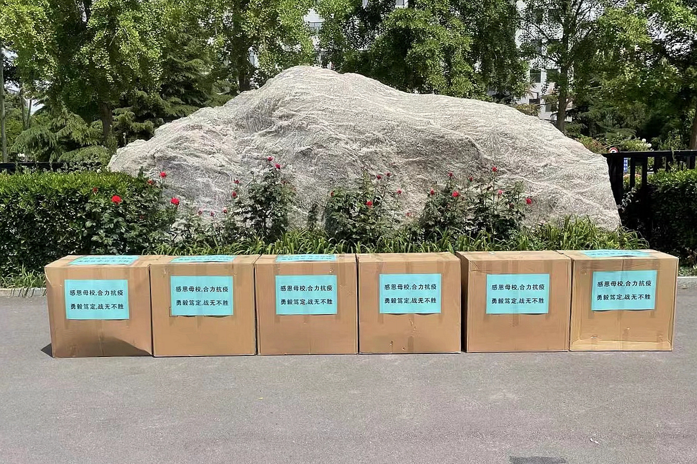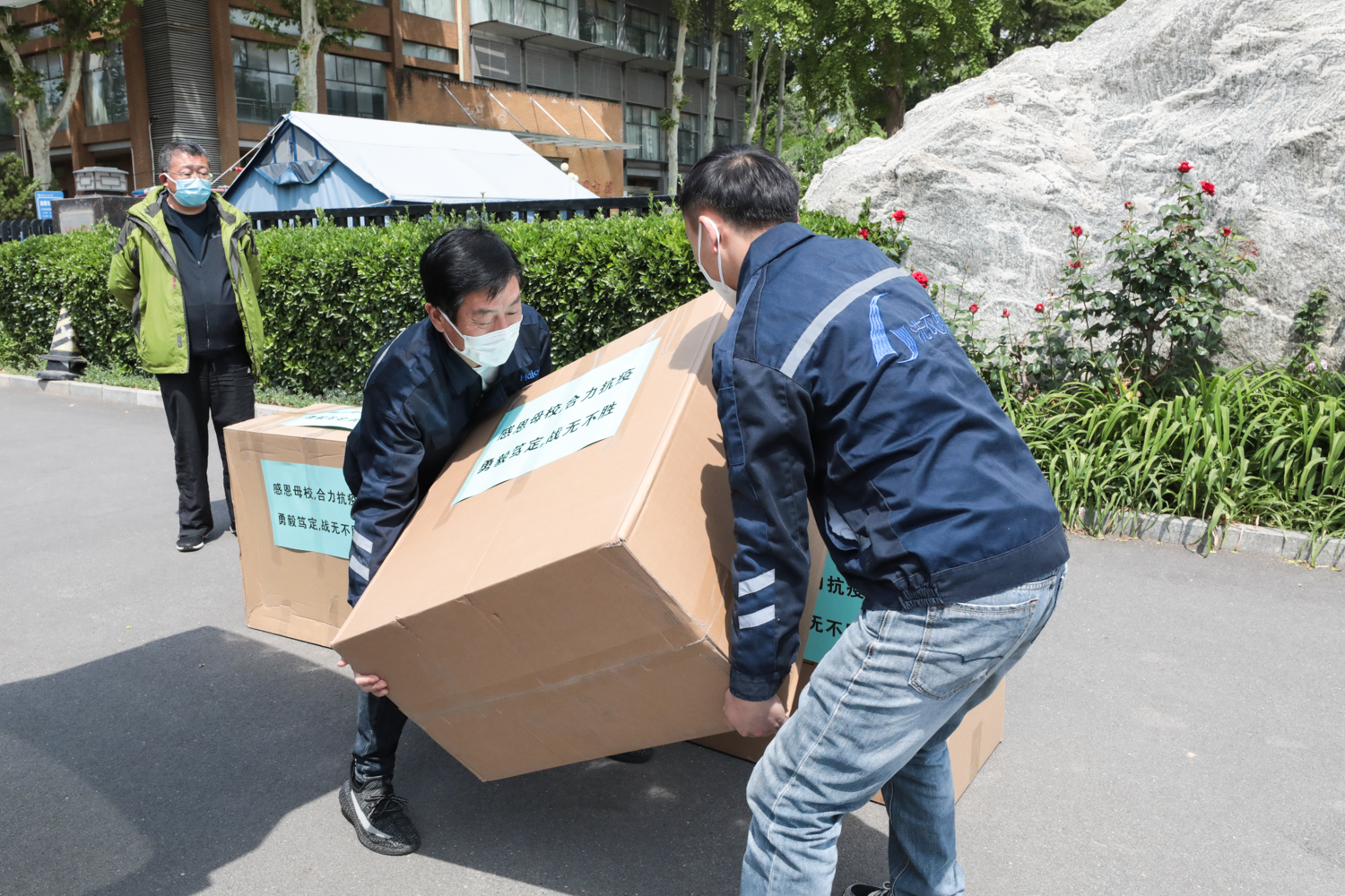 鑒于當前校園疫情防控需要,捐贈儀式從簡。工作人員對捐贈物資進行了全面消殺,從學校物資轉(zhuǎn)運專用通道運至指定地點,并及時送到食堂、物業(yè)、維修、保潔、保安等相關(guān)人員手中。收到物資后,紛紛表示“感謝校友,感謝企業(yè)”“這是對我們的關(guān)心,更是極大的鼓舞”“相信一定能夠戰(zhàn)勝疫情”……
