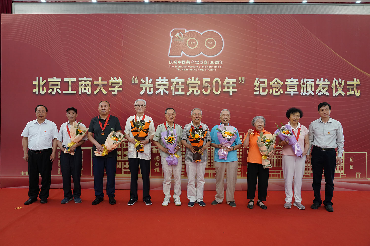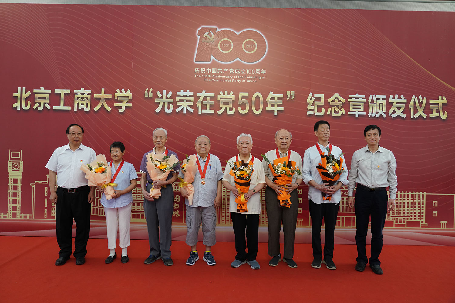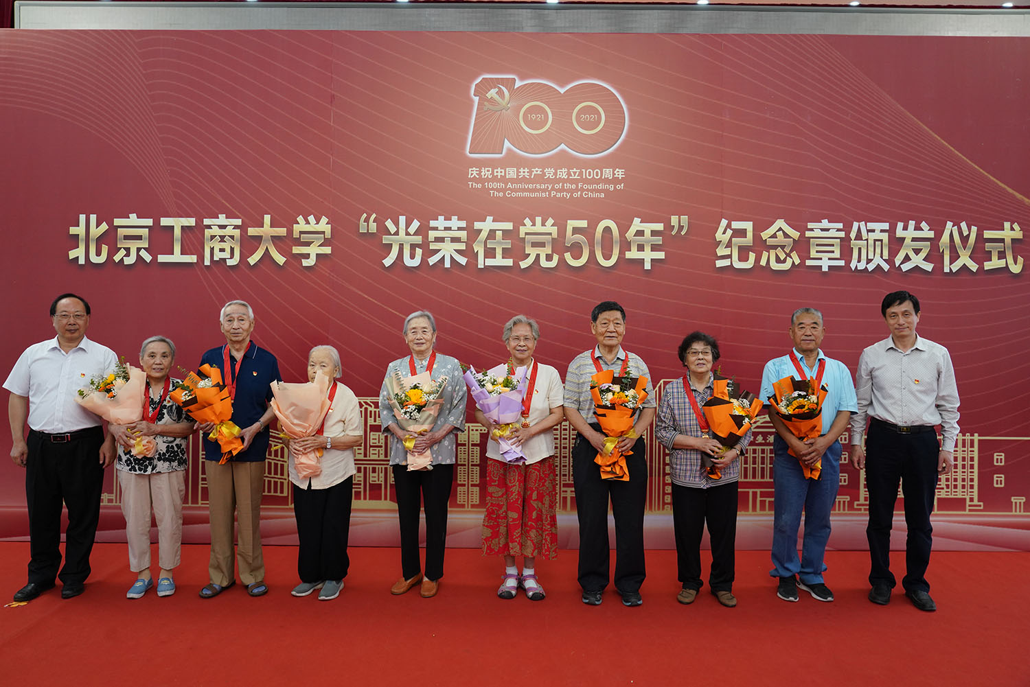 6月29日,北京工商大學“光榮在黨50年”紀念章頒發儀式在阜成路校區隆重舉行。學校黨委書記黃先開、副書記王偉,62名“光榮在黨50年”老黨員代表出席儀式。離退休工作領導小組成員、各支部書記和支部委員代表,以及食品與健康學院師生黨員代表參加儀式。