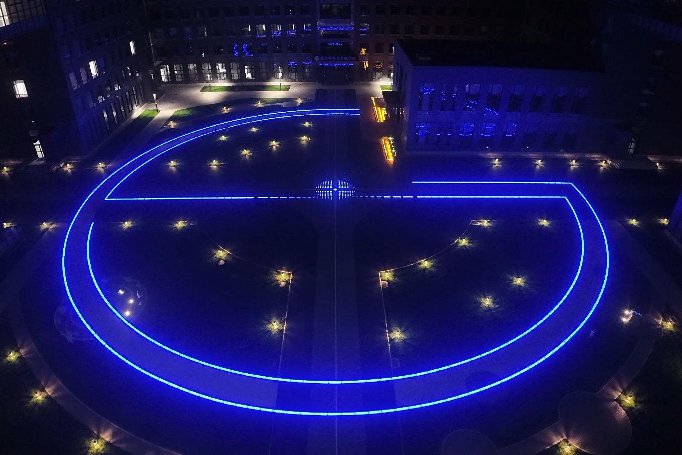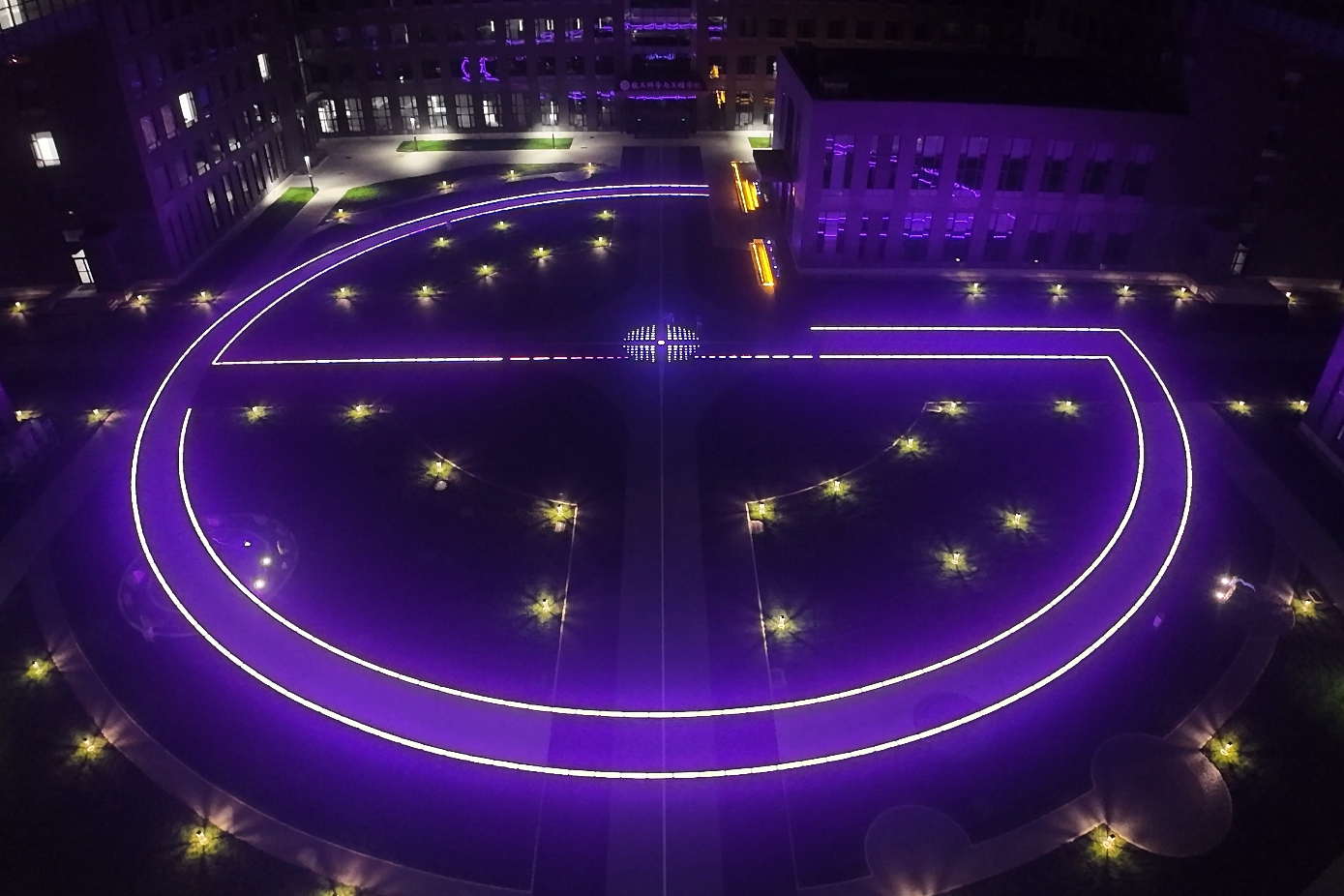 在節(jié)點(diǎn)設(shè)計上,庭院以“工商”的拼音大寫首字母“GS”構(gòu)成燈光景觀,圍繞環(huán)形輔路鋪設(shè)。工商之環(huán)在夜晚指引著道路,讓學(xué)生在科研結(jié)束后孤寂的夜也不再迷茫。
