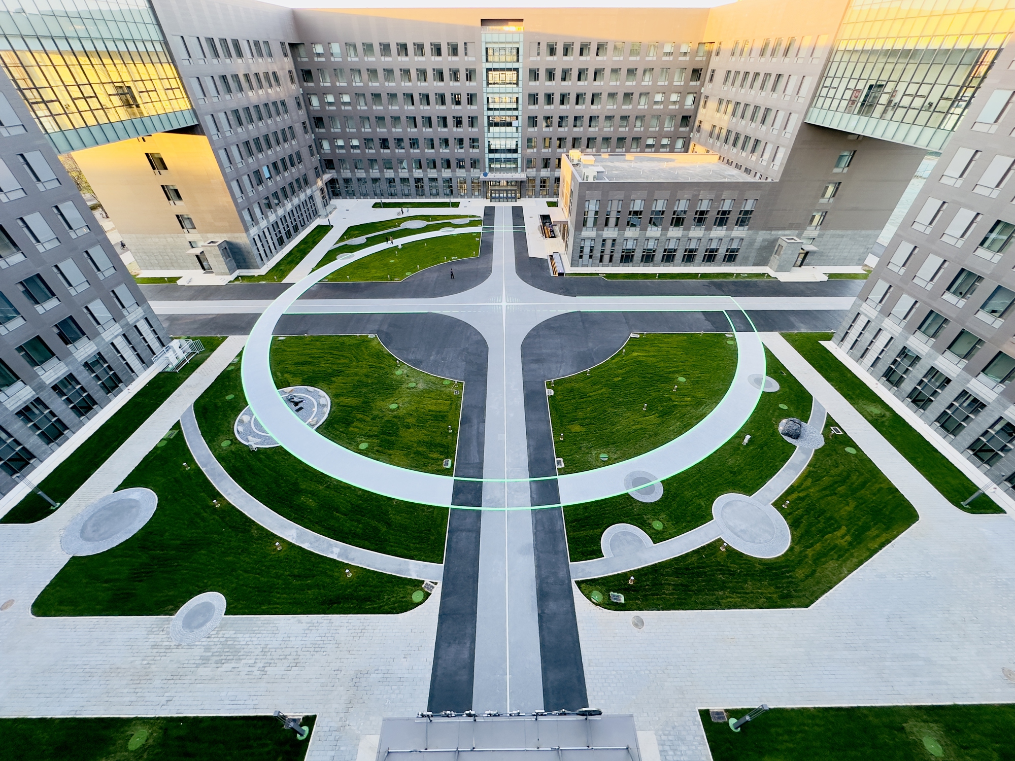 “工商之環(huán)”坐落在良鄉(xiāng)主校區(qū)輕工食品大樓的中庭里,銜接起了A座B座兩棟大樓,南北向的道路連接兩座大樓,東西向的道路向外延伸,連接中、西校區(qū);圓形的道路連接綠意盎然的三片草坪,環(huán)繞著如啟明星一般的中央?yún)^(qū)域。綠色的草坪完美柔和了四周的混凝土建筑,凸顯出生機(jī)之美,為校園增添了一處兼具自然美景與人文藝術(shù)魅力的休閑場所。